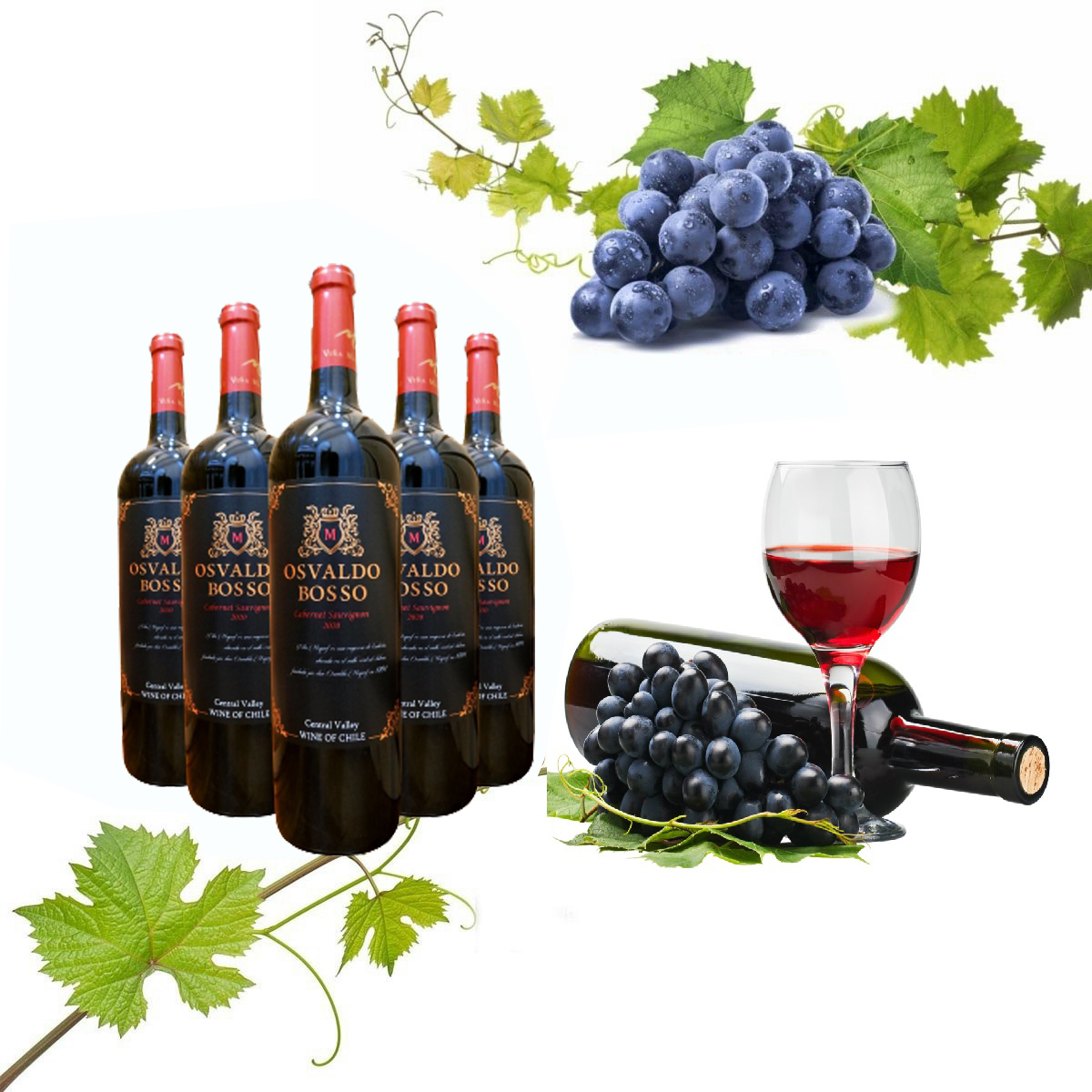 Rượu vang Chile Osvaldo Bosso được làm 100% từ giống nho Cabernet Savignon.