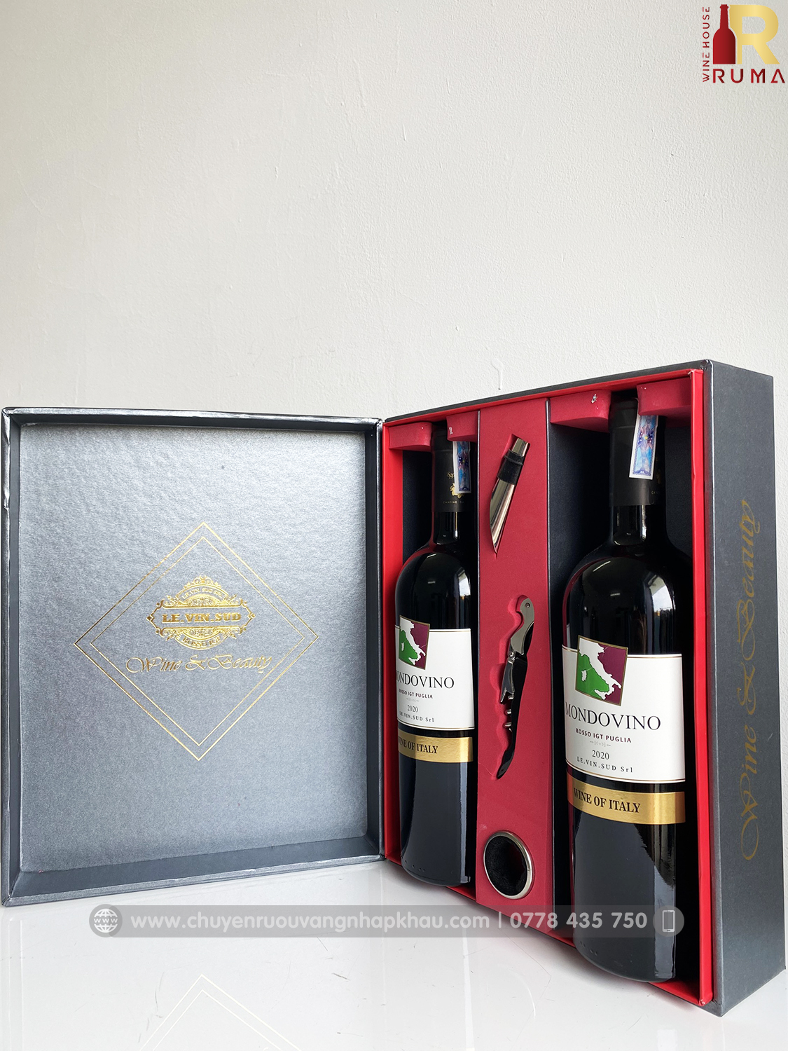 Set quà hộp hai chai vang Ý Mondovino Rosso kèm phụ kiện tại RUMA sẽ bao gồm: