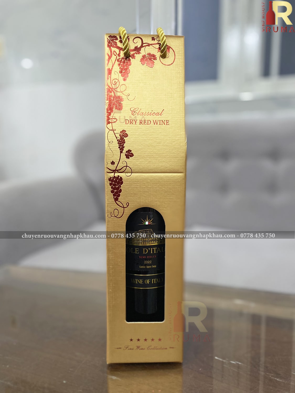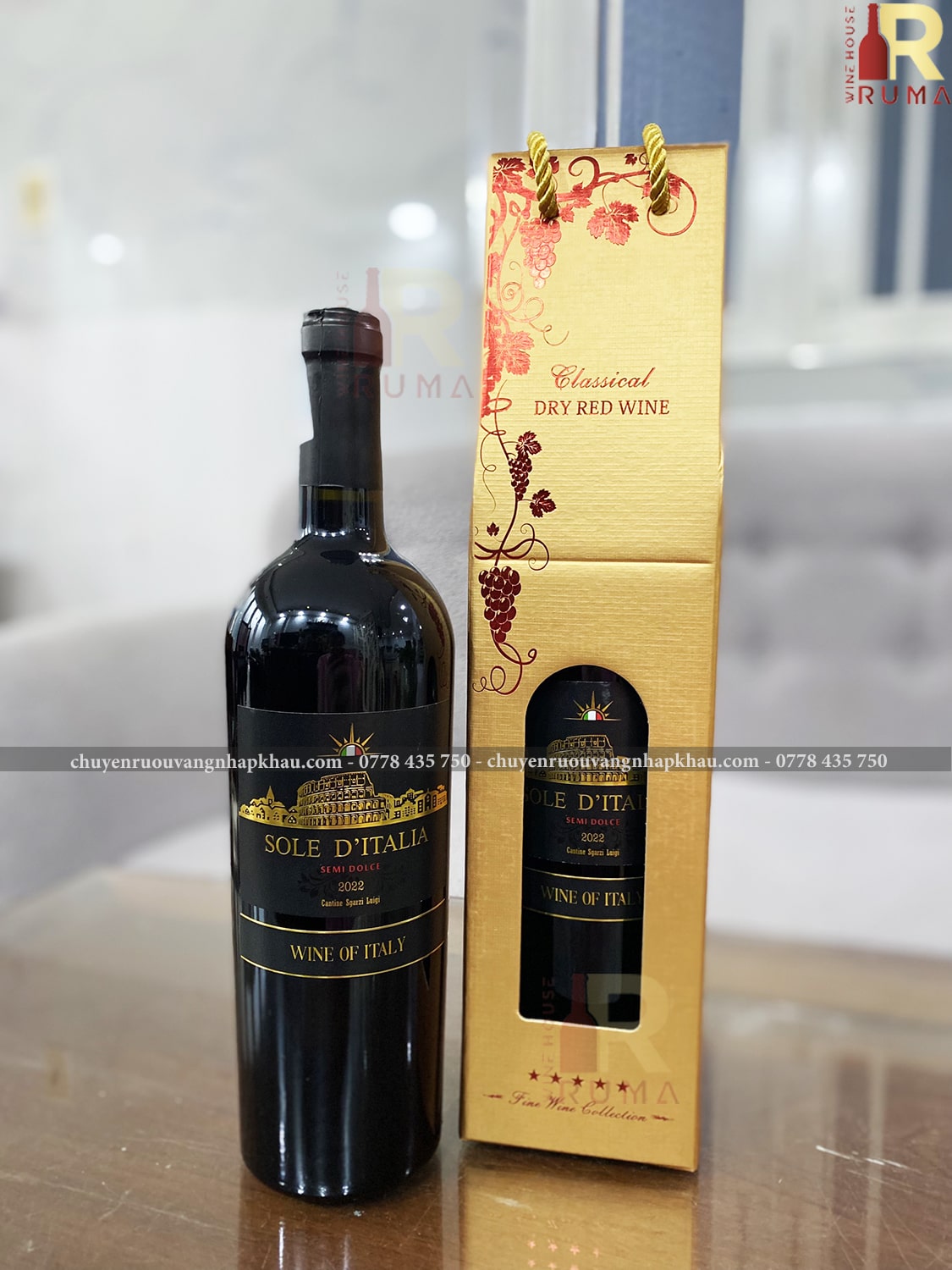 - Rượu vang Ý Sole D'Italia Semi thuộc dòng vang ngọt, được làm từ giống nho Blend, được sản xuất bởi nhà trồng nho nổi tiếng tại Ý. Vang ngọt Ý Sole D'Italia Semi được thiết kế với màu đen chủ đạo huyền bí, dáng chai cao, dài toát lên sự mạnh mẽ, nhãn chai nổi bật với hình ảnh nhà máy rượu Sole D'Italia.