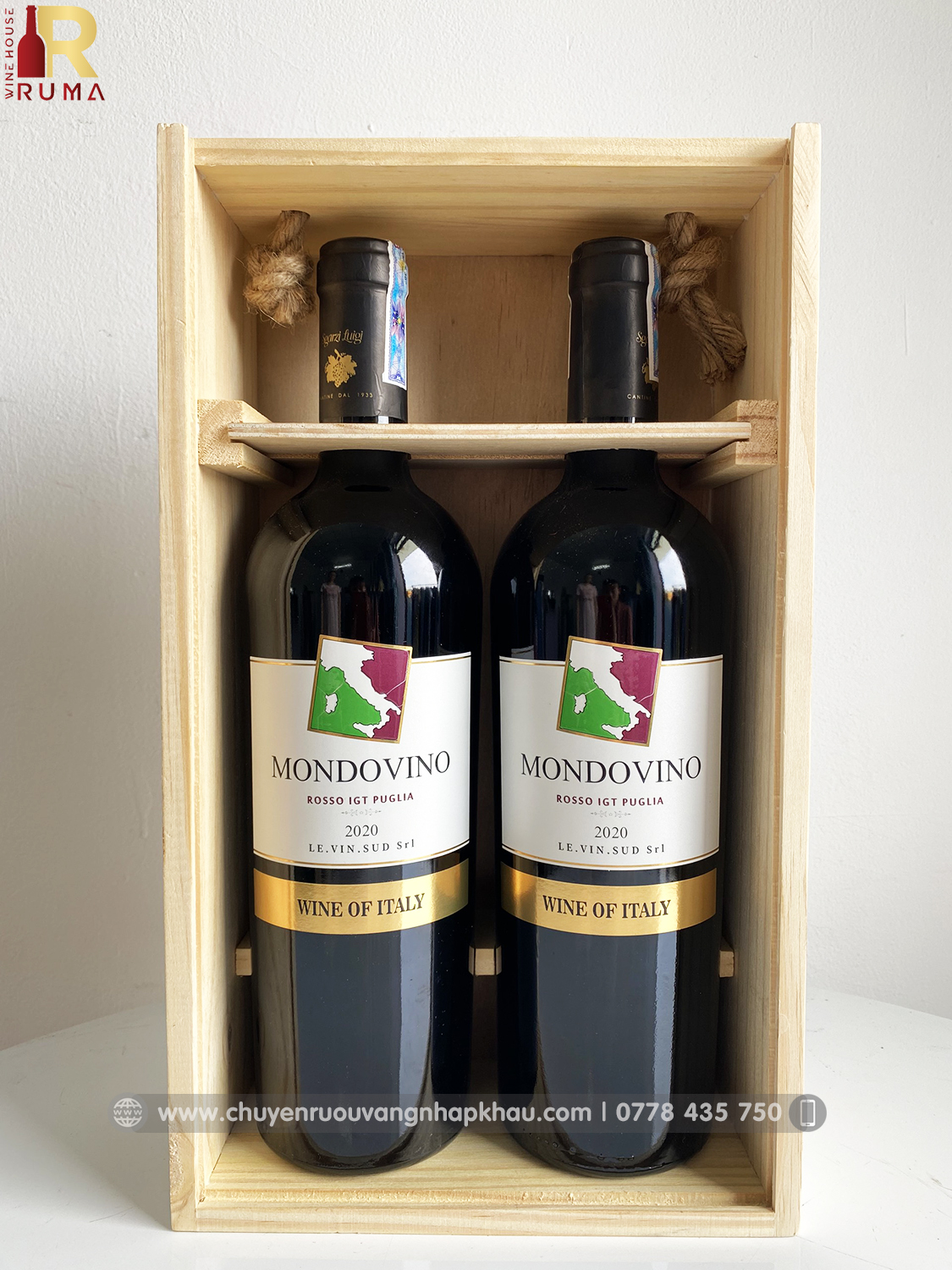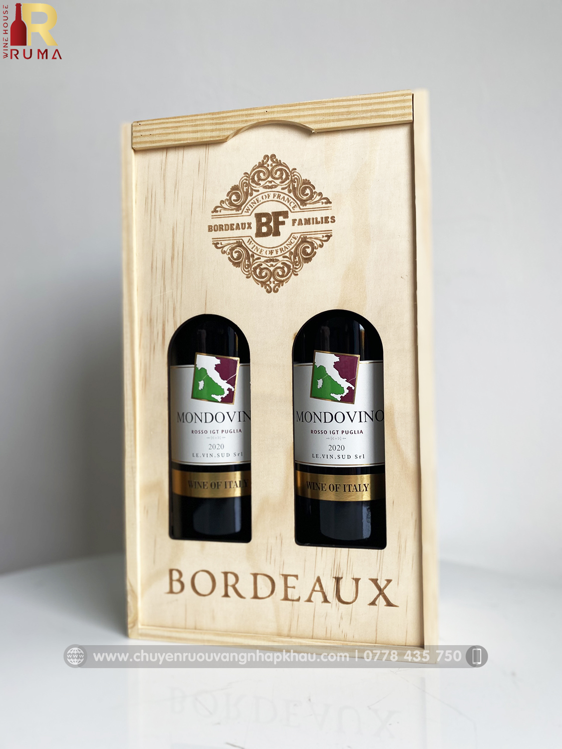Set quà tặng hộp gỗ hai chai vang Ý Mondovino Rosso tại RUMA sẽ bao gồm: