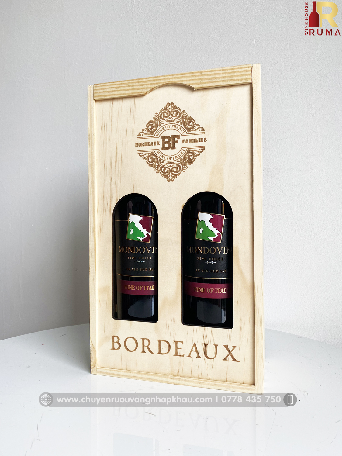 Set quà tặng hộp gỗ hai chai vang Ý Mondovino Semi tại RUMA sẽ bao gồm: